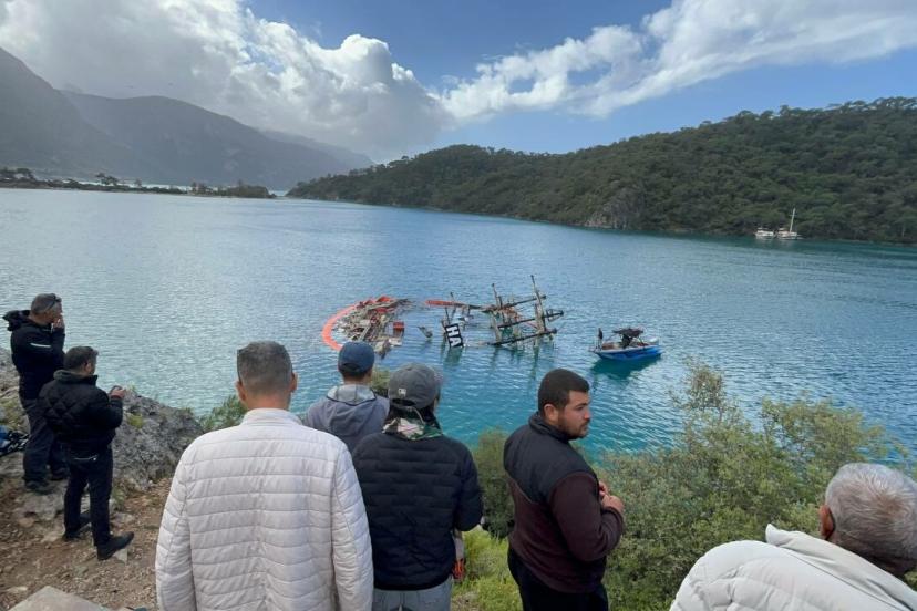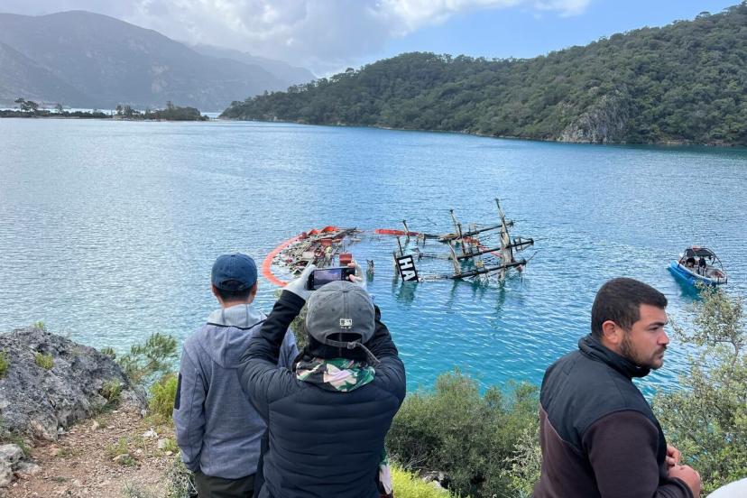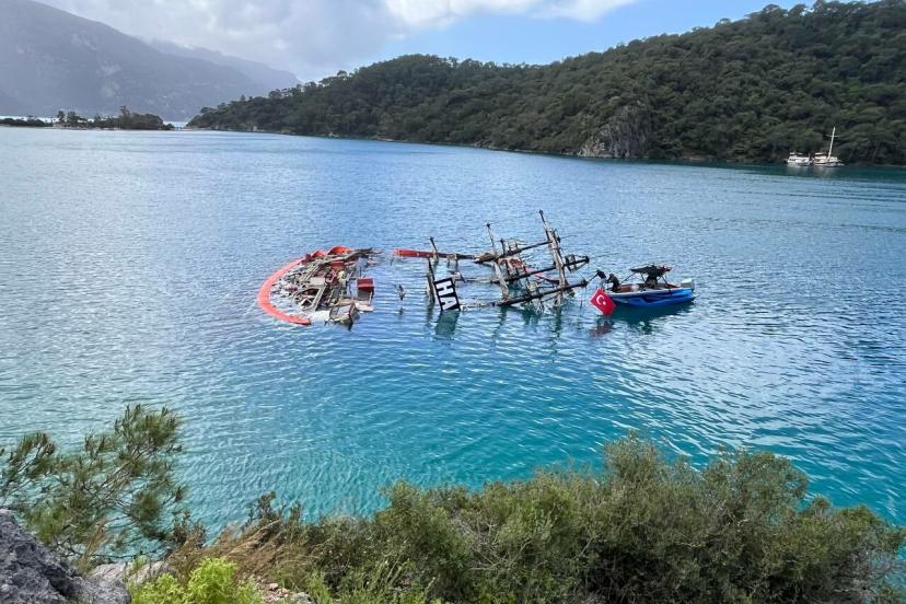 MUĞLA’nın Fethiye ilçesinde, Ölüdeniz’de, kıyıya bağlı halatının fırtına nedeniyle kopması sonucu sürüklenip, kayalıklara çarpması sonucu batan, 1 kişinin öldüğü, 6 kişinin ise kurtarıldığı 'Hanibal' isimli tur teknesinin çıkarılması için çalışma başlatıldı. Ekipler, teknenin bulunduğu bölgeyi yakıt ve yağ sızıntısının yayılmasını engellemek için özel bariyerlerle çevirdi.