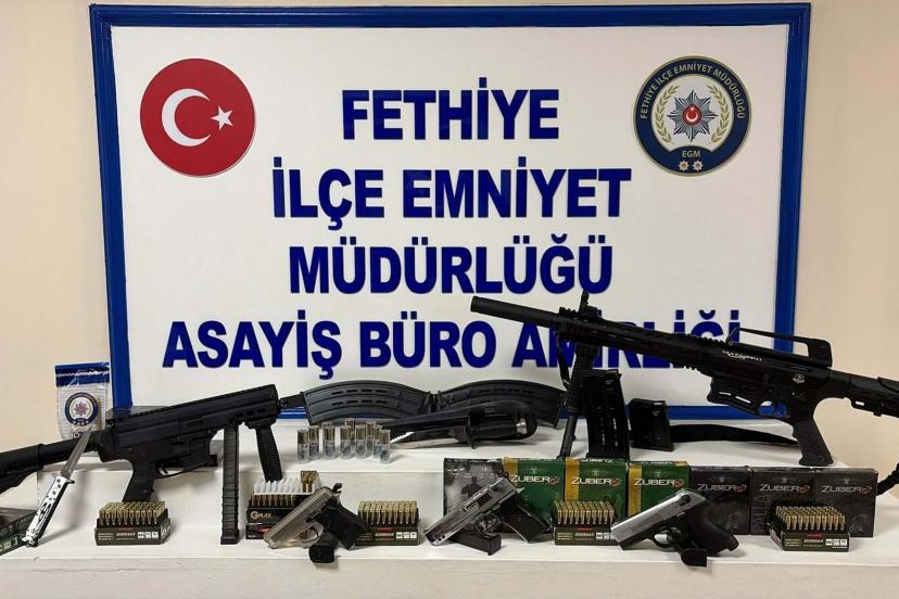 Fethiye Cumhuriyet Başsavcılığı koordinesinde, nöbetçi savcının talimatıyla Fethiye Asayiş Büro Amirliği ekipleri tarafından söz konusu evde arama yapıldı. Aramada ruhsatsız 1 otomatik tabanca ve şarjörü, 1 otomatik tüfek ve 3 şarjörü, 1 kurusıkı tabanca ve şarjörü, 123 adet av tüfeği kartuşu, 251 adet tabanca mermisi, 2 gram ham esrar ve 1 kasatura ele geçirildi. Şüpheli G.P.F., gözaltına alındı. '6136 Sayılı Kanun'a muhalefet', 'Kasten yaralama', 'Kişiyi hürriyetinden yoksun kılma' ve 'Uyuşturucu madde kullanmak' suçlarından hakkında işlem başlatılan G.P.F., adliyeye sevk edildi.