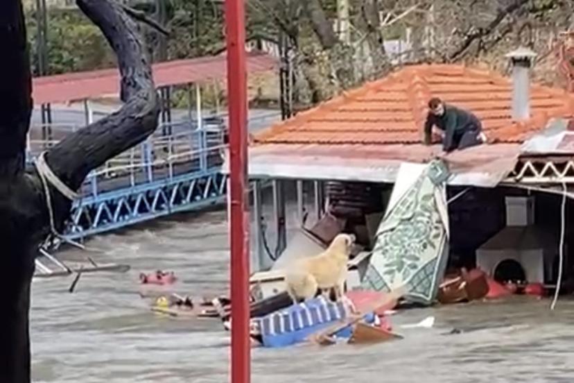 ANTALYA’nın Alanya ilçesinde debisi yükselen çaydaki taşkında mahsur kalan 'Paşa' isimli köpeği çardak çatısına çekerek, suda...