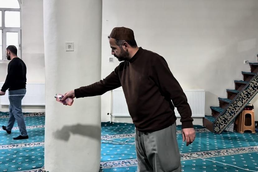 Cengiz Topel Caddesi üzerinde bulunan Esnaf Camii’nde de hazırlıklar yoğun tempoyla sürdürüldü. İmam Halil Akdoğan ve cami personeli tarafından gerçekleştirilen çalışmalarda, ibadet alanı dezenfekte edildikten sonra cami içerisine gül suyu sıkılarak manevi atmosfere uygun bir koku sağlandı.