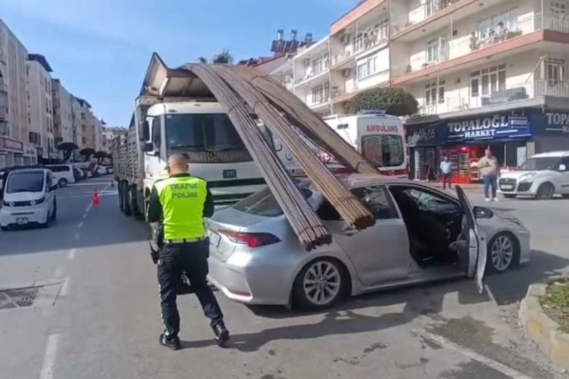 ANTALYA'nın Manavgat ilçesinde inşaat demiri yüklü kamyonun şoförü, kavşaktan dönüş yapmak isteyen sürücünün otomobiline çarpmamak için ani fren yaptı.