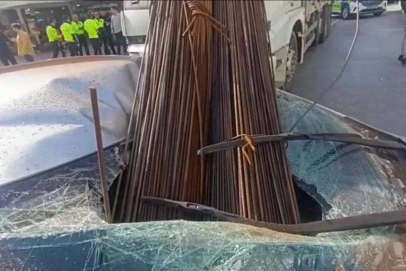 Kamyonun kasasından düşen inşaat demirleri, otomobilin tavanını deldi