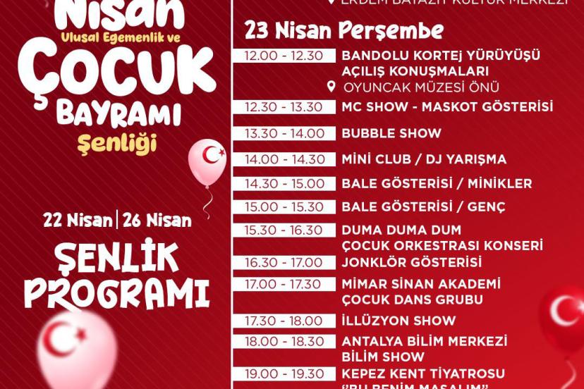 23 Nisan Perşembe günü, bayram coşkusu zirveye ulaşacak. Saat 12.00'de Antalya Oyuncak Müzesi önünde bandolu kortej yürüyüşü gerçekleştirilecek. Gün boyu sürecek programda; minikler ve gençler bale gösterileri, illüzyon şovları, bilim gösterileri, jonglör performansları ve çocuk orkestrası konseri yer alacak. Ayrıca Kepez'in ödüllü ekibi Kepez Kent Tiyatrosu 'Bu Benim Masalım' adlı oyunuyla çocuklar için sahne alacak. Aynı gün saat 14.00'te açılacak olan Geleneksel Türk Sanatları Karma Sergisi, halı-kilim ve kişisel eserlerle ziyaretçilerini ağırlayacak ve 2 Mayıs'a kadar gezilebilecek. Kum sanatı gösterisi, her zaman olduğu gibi izleyenleri sanatın büyülü dünyasına davet edecek. Antalya Bilim Merkezi ise çocukları Bilim Show etkinlikleriyle buluşturacak.